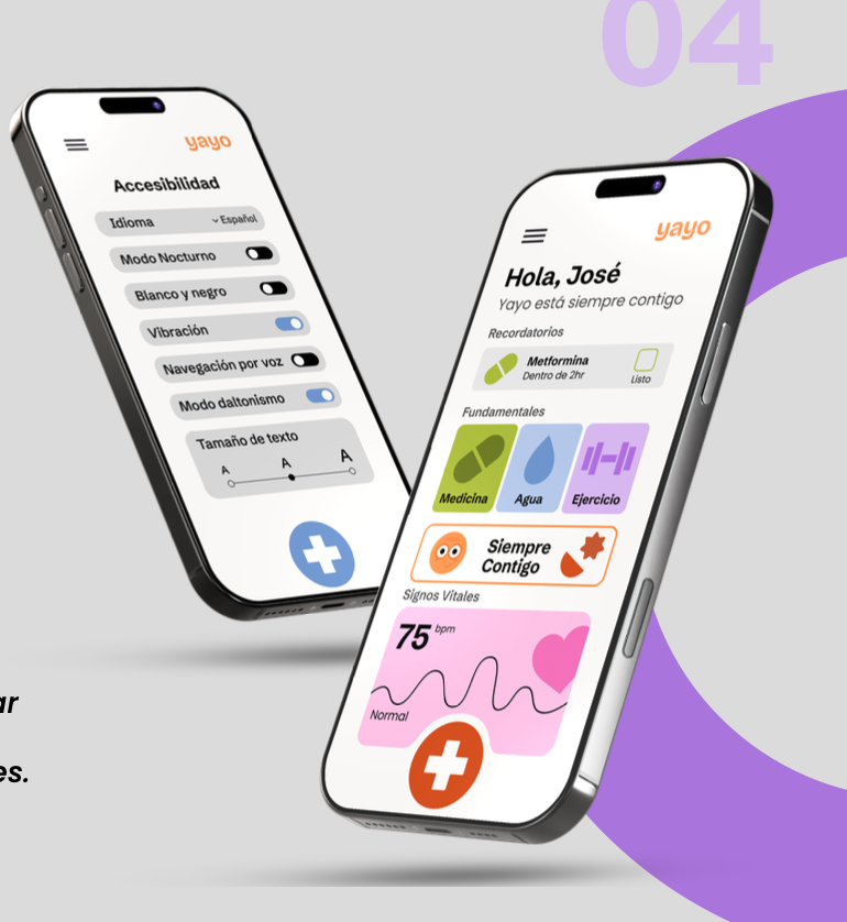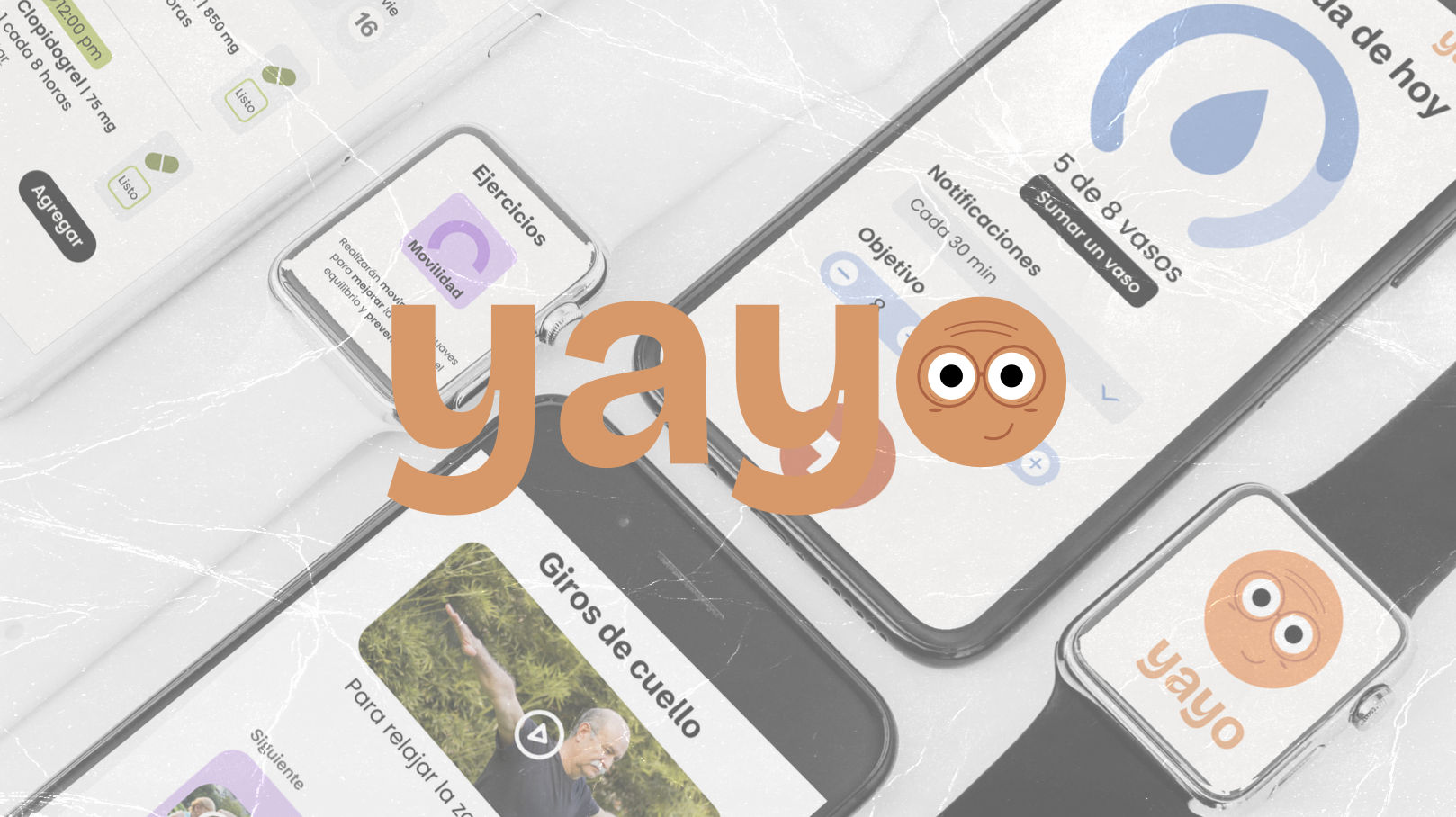 Yayo es una app móvil diseñada para cuidar la salud y bienestar de los adultos mayores, permitiéndoles registrar su consumo de agua, realizar actividades de movilidad, monitorear signos vitales y recibir recordatorios de medicación.